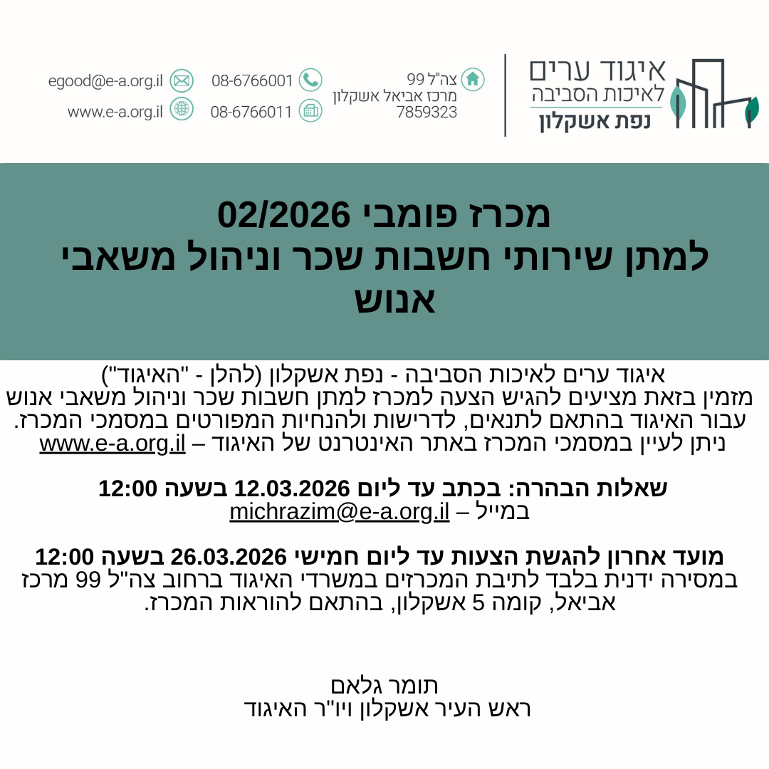 מכרז פומבי מספר 02/2026 – מתן שירותי חשבות שכר וניהול משאבי אנוש מועד שאלות הבהרה - בכתב עד יום 12/03/2026 בשעה 12:00 למייל : michrazim@e-a.org.il
