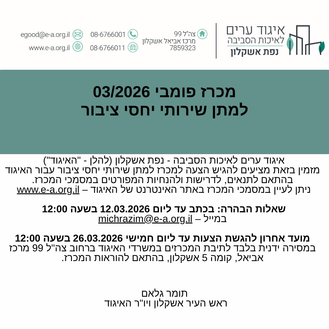 מכרז פומבי מספר 03/2026 – מתן שירותי יחסי ציבור מועד שאלות הבהרה - בכתב עד יום 12/03/2026 בשעה 12:00 למייל : michrazim@e-a.org.il